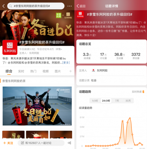 官宣当天,仅微博话题《奈雪东阿阿胶奶茶升级回归》阅读量就突破3.3亿,大量网友参与互动。“全款喜提一杯阿胶奶茶”“熬最晚的夜喝最补的奶茶”“00后的第一口阿胶”等语句频出。