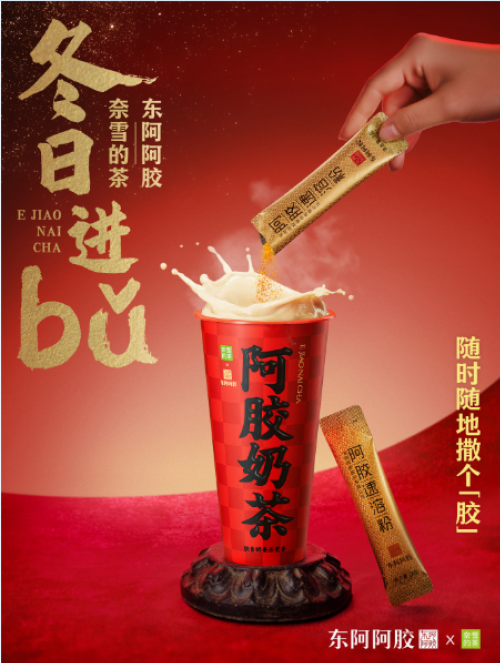 2023年12月27日,东阿阿胶与奈雪的茶跨界联名升级回归。继2023年年初首次跨界合作引发市场热烈反响后,双方继续深度合作,创新研发出更具健康特色的阿胶奶茶产品,满足消费者对于健康和美味的双重需求。