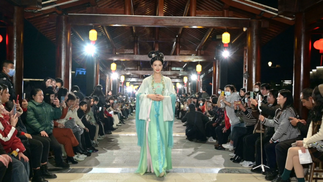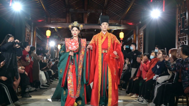 游客和市民在会昌戏剧小镇观看传统服饰T台秀。