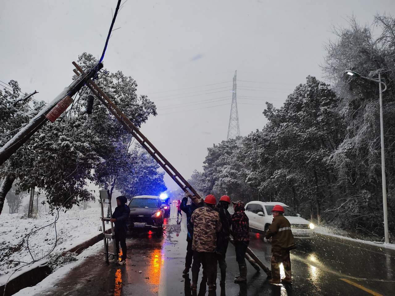 下午2时25分,吉安市青原区青东公路15公桩处,因暴雪将大树压断,导致公司主干跨路电杆倾斜,跨路高度不足4米。险情就是命令,吉安联通副总经理带队,驱车赶完现场抢修。到达现场后,根据现场杆路损坏程度,现场制定应急抢修方案。第一时间与现场值守的交警同志沟通,请求交警将道路临时封闭,给杆路抢修留出作业空间,确保现场运维抢修人员的人身安全及光缆安全。抢修人员齐心协力扶正电杆、打拉线、紧钢线,捆扎线缆,经过2个多小时紧急抢修,跨路杆线恢复至安全跨路高度,消除了安全隐患,道路恢复畅通。