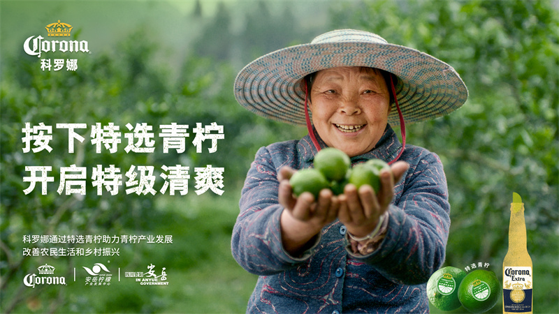 安岳是中国的“柠檬之都”,有着近百年的柠檬种植历史,也是世界五大柠檬产区之一,但素来以种植黄柠檬为主。青柠因种植难度大、产量低,储存、运输等技术要求高,加上缺乏销路,在当地少有人愿意种植。2019年,百威中国在安岳县正式启动“青柠乡村振兴项目”,通过投入资金、技术和设备,聘请专业技术团队为果农提供“保姆式”服务,帮助其提高青柠品质;同时联动当地经销商,收购符合科罗娜要求的高品质青柠,并在科罗娜的销售渠道与青柠组合销售,确保了种植户的收益。
