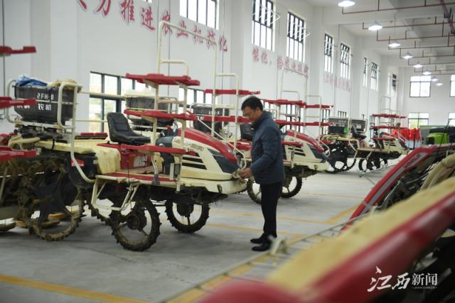 ▲潭头村村委会副主任刘锦华在村综合农事服务中心检修插秧机等设备,为春耕作准备。摄影丨江西日报全媒体记者焦俊杰