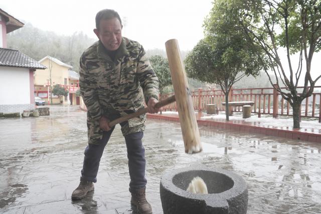 ▲神山村村民李宗吾一边示范打糍粑一边讲解动作要领。摄影|朱宸廷