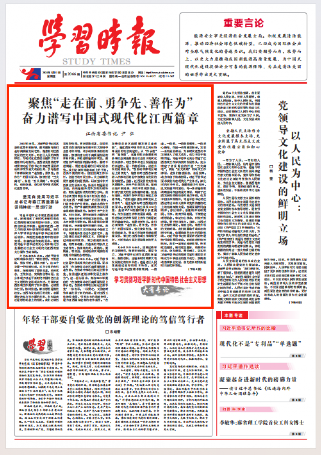 习近平总书记的重要讲话,既着眼中国式现代化建设全局,又紧贴江西发展实际,既有方法论,又有实践论,指明了推动江西高质量发展的方向路径。我们必须聚焦重点、抓住关键,以重点突破带动全面落实,推动高质量发展迈出新的更大步伐,不断提升江西在全国发展大局中的位势。