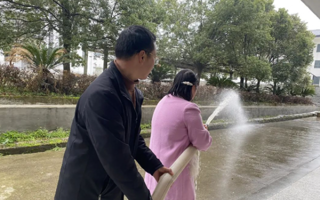 金鹏通过理论指导与实际操作相结合的方式,向全体教职工及食堂工作人员讲解、演示了灭火器的使用方法及注意事项,提醒大家在使用灭火器时谨记四个字,即提(提起灭火器)、拔(拔下安全销)、握(握住软管顶端)、压(压下手柄)。此外,他还讲解了消防栓及消防软管的使用及注意事项,老师们积极参与演示学习。