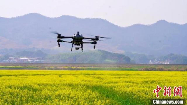 图为江西九江瑞昌市赛湖街道高标准农田上空,一架无人机正在开展油菜病虫害统防统治“飞防”作业。受访者供图