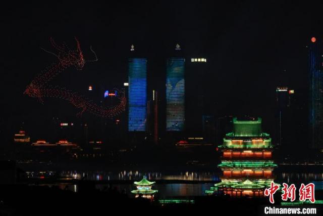 2月24日,大年初一,南昌市烟火晚会上2400架无人机编队、悬停,组成两条“巨龙”翱翔在赣江两岸上空,后来又组成“新年好”“南昌味道”“福娃送福”“南昌欢迎您”等文字或图案在一江两岸上空为市民送上新春祝福。
