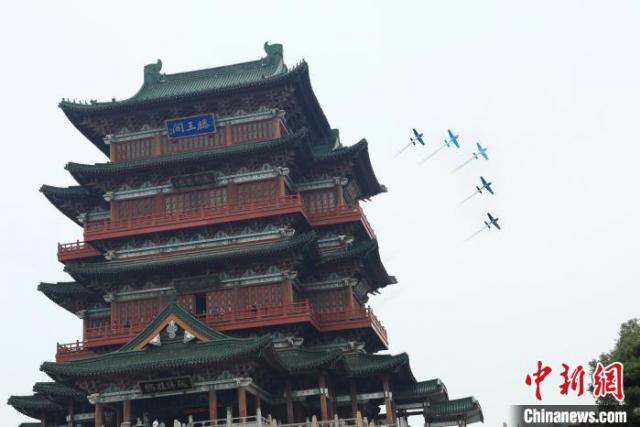 图为2023年10月25日上午,外籍飞行表演队“飞跃滕王阁”城市飞行表演,飞行编队拉烟飞过滕王阁。刘思伟摄