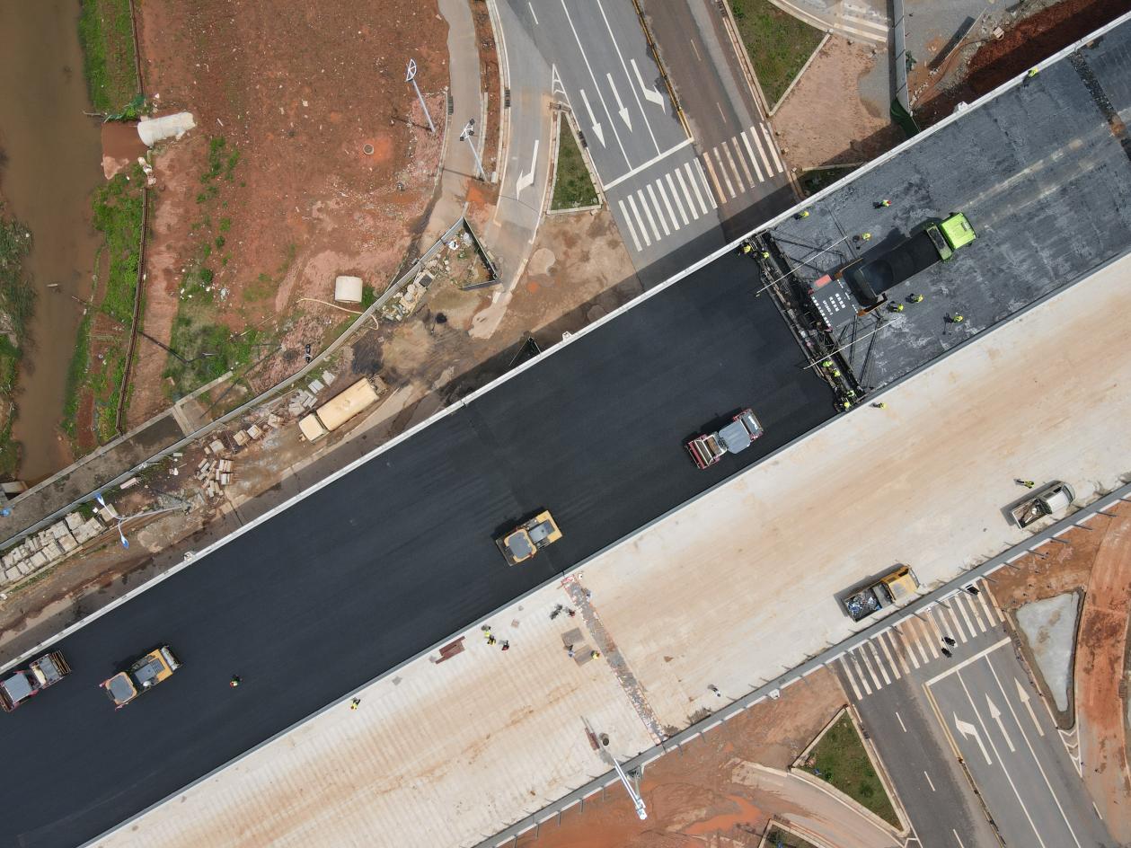 目前,大桥在铺设沥青的同时,主缆吊杆、主塔日字形结构拼装以及附属工程也在同步进行,抓质量、强保障、提速度,全力以赴推进项目建设,确保实现通车目标。