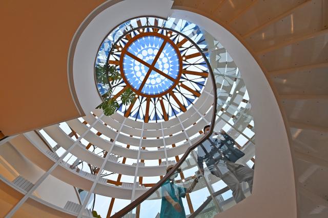 ▲4月19日,一对情侣读者经过莲花书屋的螺旋式楼梯,穹顶上可以看见星空。摄影丨江西日报首席全媒体记者李劼