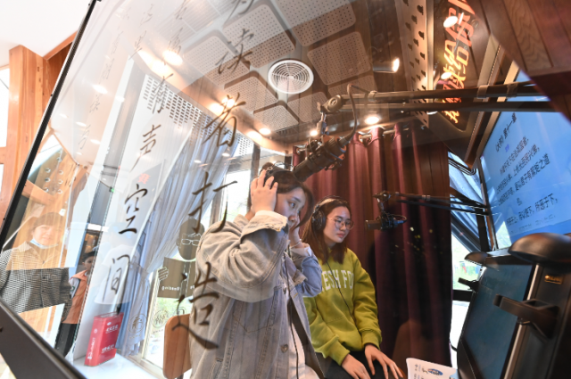 ▲4月19日,两位女读者正在“我想读给你听”朗读亭内诵读,音频可分享到网络朋友圈。摄影丨江西日报首席全媒体记者李劼