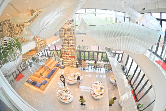 ▲4月3日,还在试运行中的南昌未来空间·未未时合集馆智慧阅读区,通天的书墙与龙形飘带灯相得益彰,镜面与挑空的设计,美感十足。摄影丨江西日报首席全媒体记者李劼