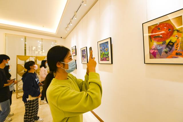 ▲4月20日,南昌高新区图书馆内,一个年轻读者正在用手机拍摄墙壁上悬挂的孤独症儿童的画作。摄影丨江西日报首席全媒体记者李劼