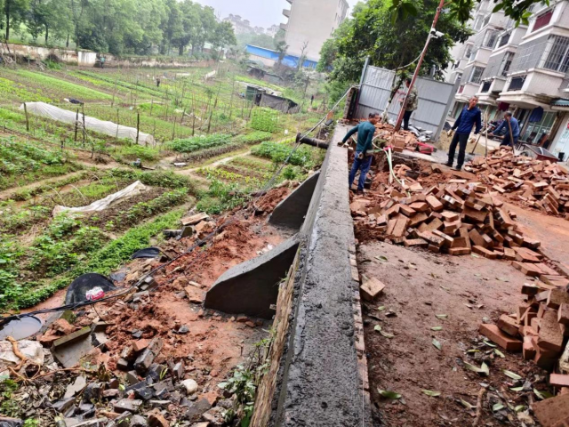 嘉禾苑2栋靠南面围墙,由于地势和结构老旧等原因,导致墙体产生裂缝,今年上半年以来,因连日暴雨加上强对流天气多次降雨的冲刷,道路路缘石及路肩损坏,坡脚浆砌块石挡土墙损坏,滑落土体堆积至坡脚菜园,内部管线裸露,墙体下方凹陷,挡墙垮塌区域两侧的挡墙出现不同程度的开裂,造成部分围墙倒塌,如不治理,存在很大的安全隐患。