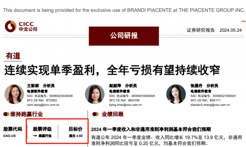 日前,国内知名投行中金公司发布最新报告称,维持国内教育科技公司网易有道(NYSE:DAO)跑赢行业评级,目标价4.60美元,并预计网易有道全年亏损有望持续收窄。