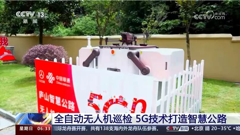央视《朝闻天下》5G发牌五周年报道江西联通在庐山公路打造的全国首个“全自动无人机巡检”智慧公路