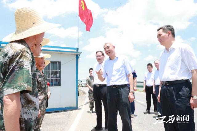 烈日之下,防汛值守人员冒着酷暑在堤脚拉网式排查。尹弘详细了解巡堤查险安排、人员值班值守、防汛物资储备等情况,看望慰问奋战在一线的防汛值守人员,感谢大家的日夜坚守和辛勤付出。他指出,江湖水位正在缓慢下降。退水之时,加上天气晴好,容易滋生麻痹思想、松懈情绪。要坚持坚守,加大巡堤频次,加大巡查范围,确保防汛力量不减、劲头不松、标准不降。要广泛动员群众、发动群众、依靠群众,积极发挥当地老干部、老党员、老水利、老把式情况熟悉、经验丰富的优势,切实形成防汛工作强大合力。