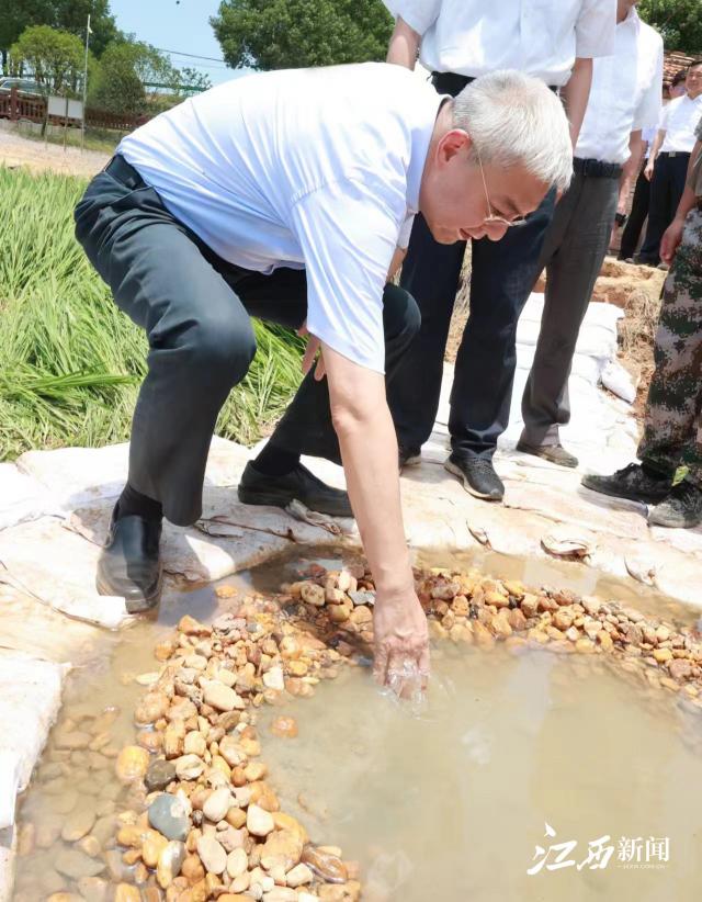 南昌县塘南镇红旗联圩承担着南昌城区东面的防汛安全。尹弘实地察看水情水位,详细了解南昌市防汛工作情况。圩堤内一处农田,7月6日晚发现了一处泡泉,现场进行了及时处置。尹弘来到泡泉点,察看防范处置情况,要求提高警惕、严加防范。他强调,堤坝经高水位长久浸泡,出险的因素不断叠加。我们要进一步强化风险意识、底线思维,密切关注险工险段、穿堤建筑物等重点部位,对可能出现的各类险情做到心中有数、应对有方、处置有效,确保一旦有险情能早发现、早处置。