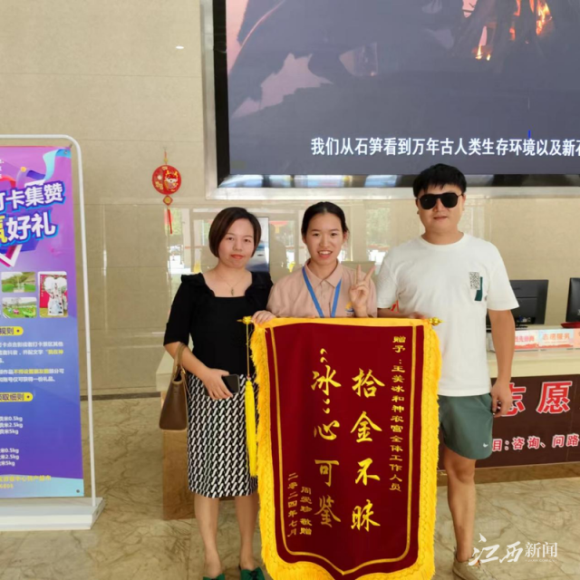 7月28日,周先生特意制作了一面锦旗送往景区,上面写着“拾金不昧‘冰’心可鉴”,再次感谢了导游王美冰,并表示以后有机会一定会再带家人朋友到上饶来,感受这里的美景。