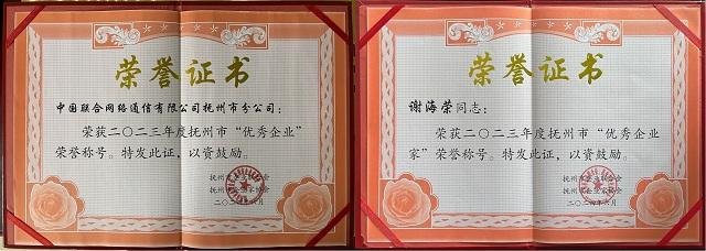 喜讯!抚州联通被评为“2023年优秀企业”,抚州联通党委书记、总经理谢海荣荣获“优秀企业家”称号