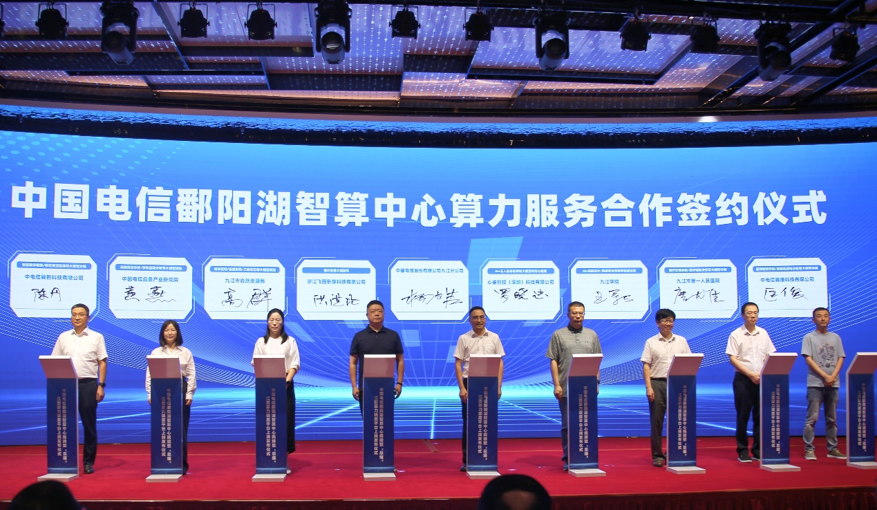 发布会现场,来自省内外教育、医疗、科研机构、工业企业等行业客户与中国电信鄱阳湖智算中心签订算力服务合作协议,成为首批智算应用客户。