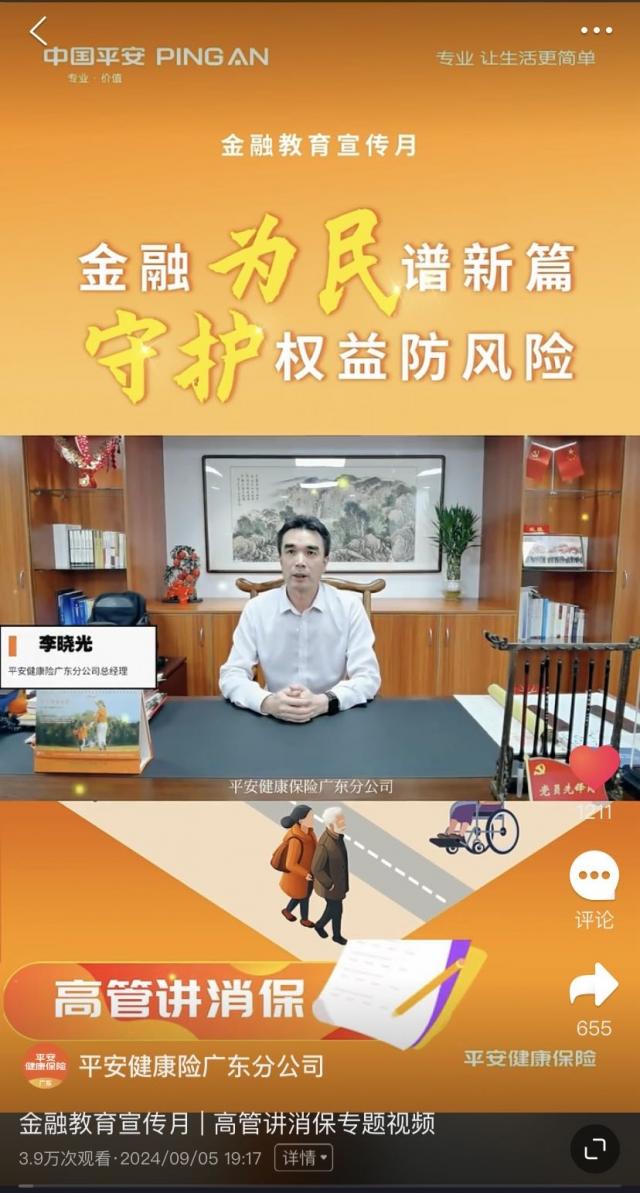此外,通过组织开展“高管讲消保”活动,平安健康险广东分公司总经理李晓光在线上视频为广大消费者传递行业诚信文化,坚决履行《保险行业消费者权益保护自律公约》,以生动形象向社会公众展现金融行业讲诚信、守担当的形象。