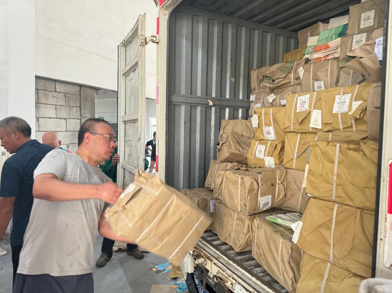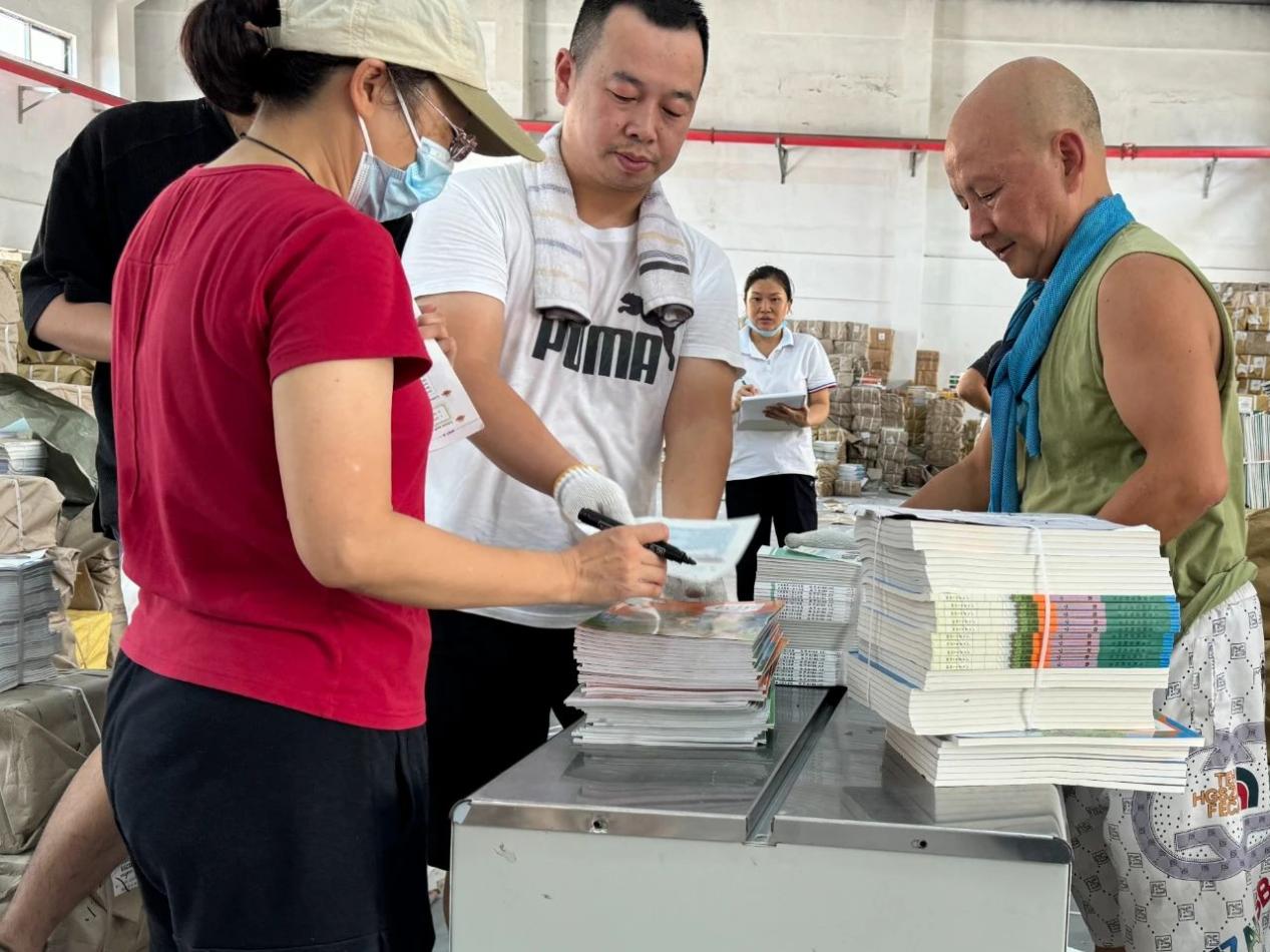 发书期间,工作人员顶着高温,挥汗如雨,按照“即到即卸、即卸即分、即分即发”的原则,在认真清点种类和核对数量后,进行打包、装车,教材发放一路有序高效。他们加班加点,只为确保每一本教材能够准确无误地送达学校,为孩子们新学期提供坚实的学习保障。