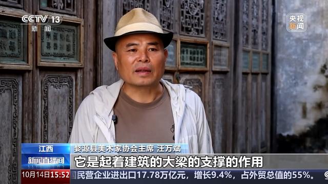 婺源县美术家协会主席汪万斌:建筑中重要的一个构建叫斜撑,我们俗语叫牛腿,它是起着建筑的大梁的支撑的作用。这个建筑斜撑是刻上了倒爬狮子跟这个荷花鹭鸶,这个非常有寓意的这种吉祥图案。还有我们的大梁,比如鲤鱼跳龙门这样的精美图案,就是励志年轻人应该奋发图强,像鲤鱼跳龙门一样化鱼为龙。