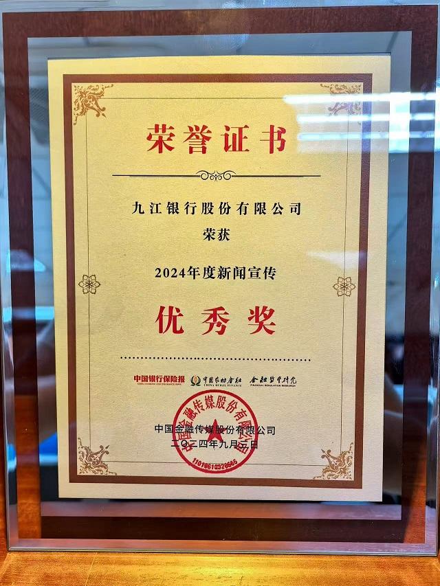 近日,中国金融传媒通报表彰了2024年度中国金融传媒新闻宣传工作先进单位,其中,九江银行荣获“2024年度新闻宣传优秀奖”。这是继今年初获评中国银行业协会2023年银行业“保障民生”好新闻奖之后,九江银行在新闻宣传工作领域获得的又一殊荣。
