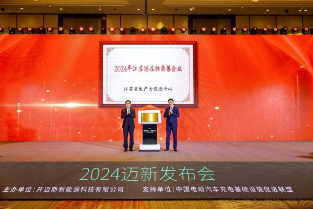 在江苏省生产力促进中心发布的2024年独角兽企业评估中,开迈斯凭借出色的研发实力、快速成长能力和巨大发展潜力,荣获“2024年江苏省潜在独角兽企业”称号。常州市人民政府副秘书长陈峰与开迈斯总经理兼首席执行官周显涛共同为这份荣誉揭牌。这一荣誉不仅是对开迈斯在新能源领域持续创新与实践的肯定,也是对其未来发展潜力的高度认可。