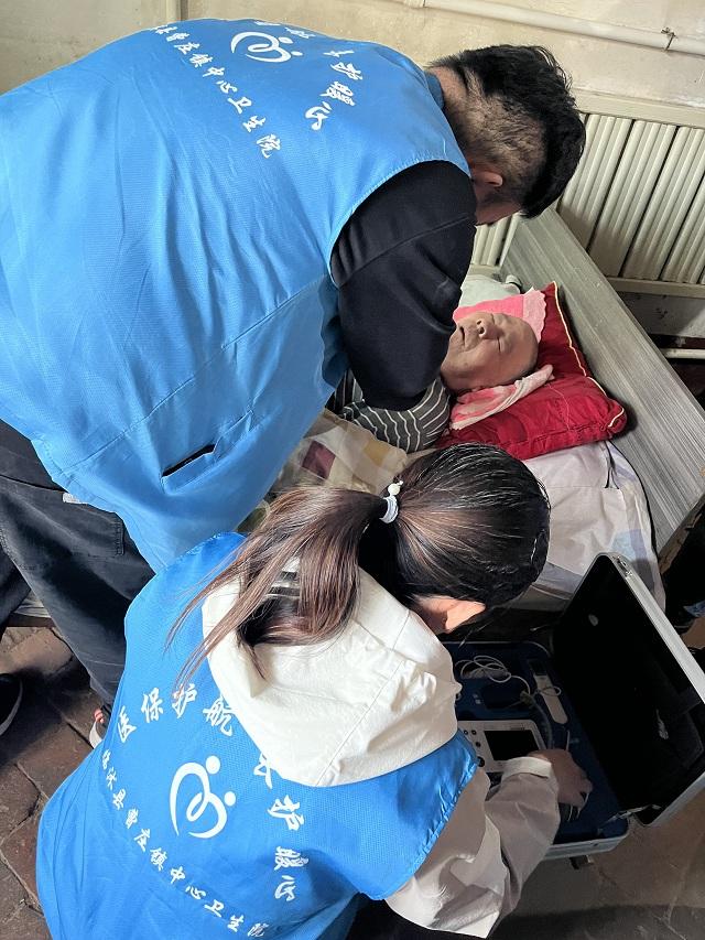 图:曹庄镇中心卫生院医护人员为王大爷检查身体