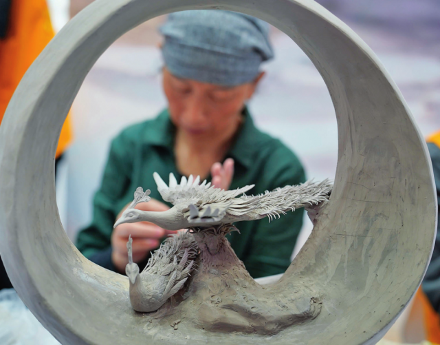 在 2023 中国景德镇国际陶瓷博览会瓷都工匠技艺展示馆,一名“瓷都工匠”在展 示捏雕技艺(2023 年 10 月 18 日摄) 周密摄/本刊