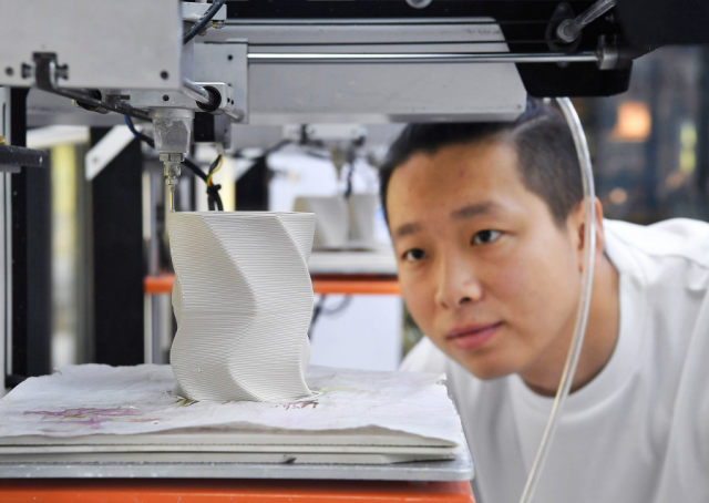 在景德镇陶溪川文创街区的陶瓷 3D 打印体验中心,一位工作人员在用 3D 打印技术制作陶瓷花瓶(资料照片) 万象 摄/本刊