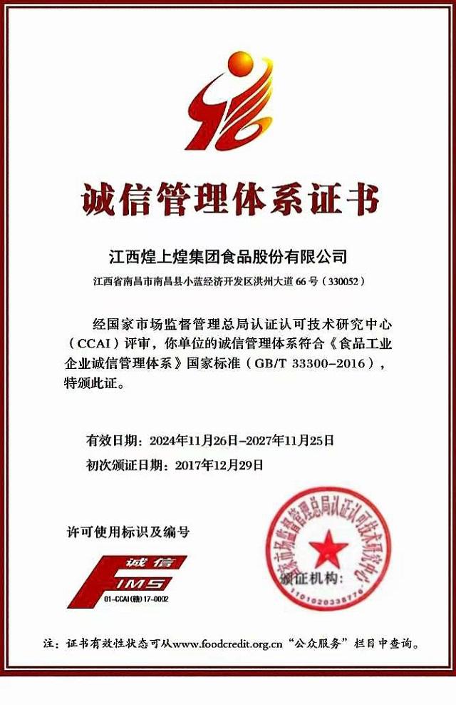 江西煌上煌集团积极参与和推动食品工业企业诚信体系建设,经国家市场监督管理总局认证认可技术研究中心(CCAI)评审,获得诚信管理体系证书,通过建立和运行诚信管理体系,确保企业从各环节和各过程防范失信风险,减少食品安全事故发生。