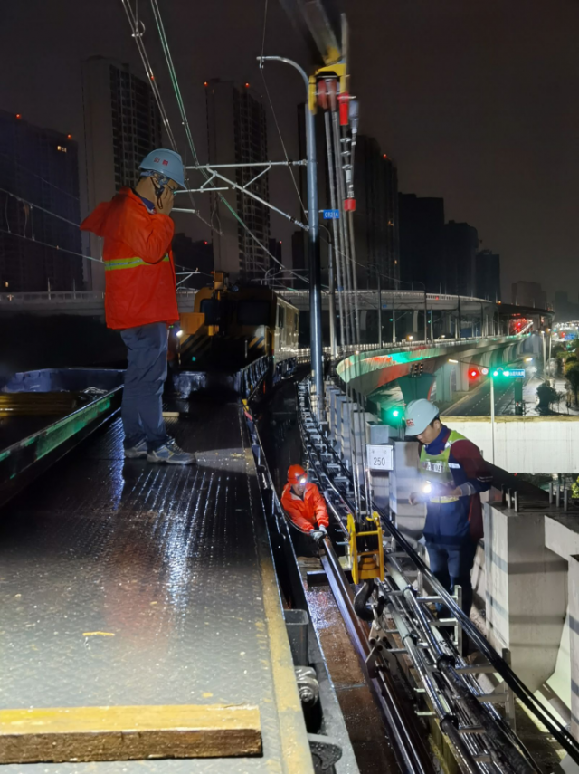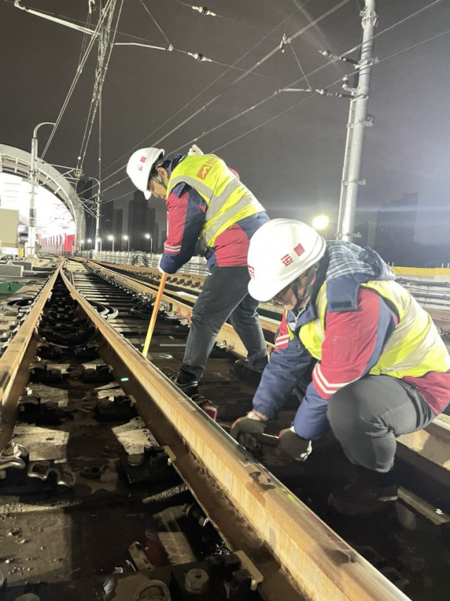 面对昼夜气温差较大的情况,运营分公司紧盯露天段大轨缝和易伤损钢轨位置等薄弱环节,加紧轨道弹条扣件,锁住轨道变形,防止后续大降温带来的突发情况。(安排专人每周3次进行高架线路进行轨道设备巡检,对高架区域6组钢轨伸缩调节器、14组道岔及12公里线路进行全面扣件加力工作,力求将低温对轨道设备的影响降到最低。)