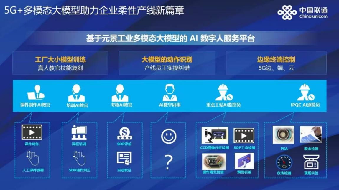 为应对这些挑战,江西联通凭借其在AI领域的技术优势,与立讯智造紧密合作,共同打造了“AI数字人教官”项目。该项目基于智能体架构构建多模态大模型能力平台,依托元景电子行业大模型能力底座,集成了课件制作、培训、考核和作业巡检等一系列功能,为企业5万员工提供了高效的在线服务。