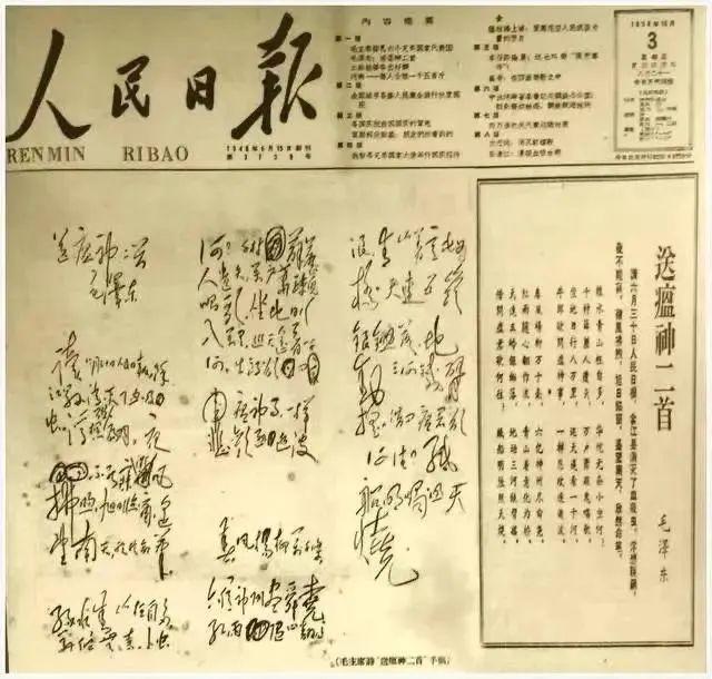 1958年10月3日,《人民日报》发表毛泽东《七律二首·送瘟神》。