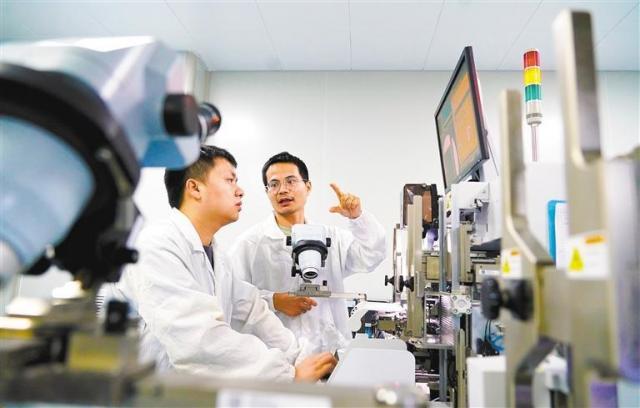 南昌大学国家硅基LED工程技术研究中心研发人员在实验室交流讨论。该研究中心基于高光效硅基黄光LED芯片开发的LED无粉照明光源技术,属于国际首创。