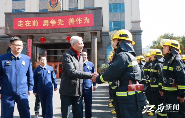 来到赣州市消防救援支队,尹弘观摩消防救援特种车辆及各类装备,走进指挥中心,了解节日期间值班值守、消防保障等情况,并看望慰问一线消防救援指战员,向大家送上新春祝福。尹弘说,消防救援职责重大、使命光荣,哪里有危险,哪里就有你们的影子,你们是一支英勇善战、屡立战功的光荣队伍。希望大家发扬优良作风,保持战备状态,苦练内功、提高本领,依靠现代信息技术提升消防安全工作水平,切实保障人民群众生命财产安全。