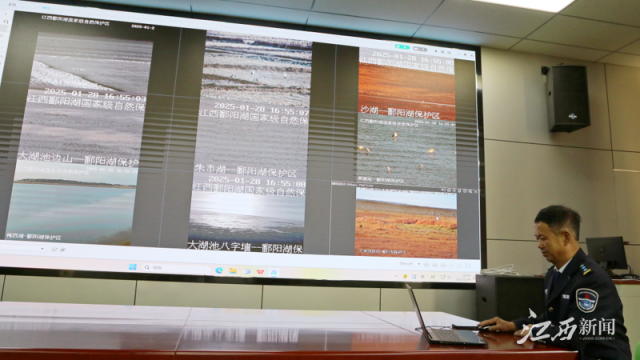 16时57分,他来到智慧平台监控大屏前,实时查看湖区情况。智慧平台通过基站、无人机、摄像头等进行多层次综合入侵预警,既减轻巡护人员负担,又能够对入侵事件进行有效侦测监管。AI识鸟系统能够实时对鸟类种类进行辨别,还可以对鸟群的密度、数量进行精确计算。“这些年,随着江西候鸟保护和宣传的力度加大,现在盗猎候鸟的情况已经很少了。”王小龙介绍道。