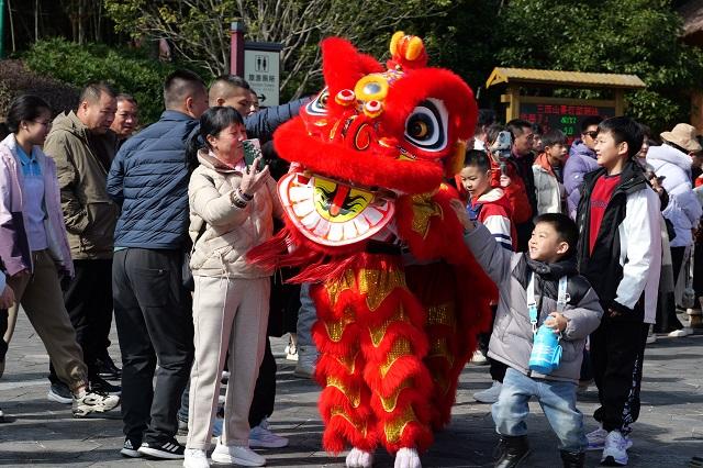在舞狮表演的热烈氛围中,众“仙”身着华丽服饰,在景区内巡游,为游客送上新春惊喜。众“仙”所到之处,人群如潮水般涌动,尤其是慈航降瑞、祈福许愿等环节吸引了众多游客参与,欢声笑语不断。“看来今年我要努力工作赚宝宝的奶粉钱,让财神的祝福成真!”被财神“关照”的奶爸唐先生边说边把刚拍的照片分享到微信朋友圈,很快便被亲朋好友的点赞和评论刷屏。