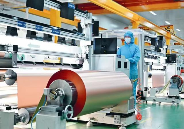▲铜产业是江西工业的一张亮丽名片。2013年至今,江西省铜材产量连续12年居全国第一位。图为2025年2月27日,江铜集团南昌高新产业园的锂电铜箔生产车间内,一张张纤薄的铜箔沿着轮轴滚卷而出。摄影|江西日报记者 张翰林
