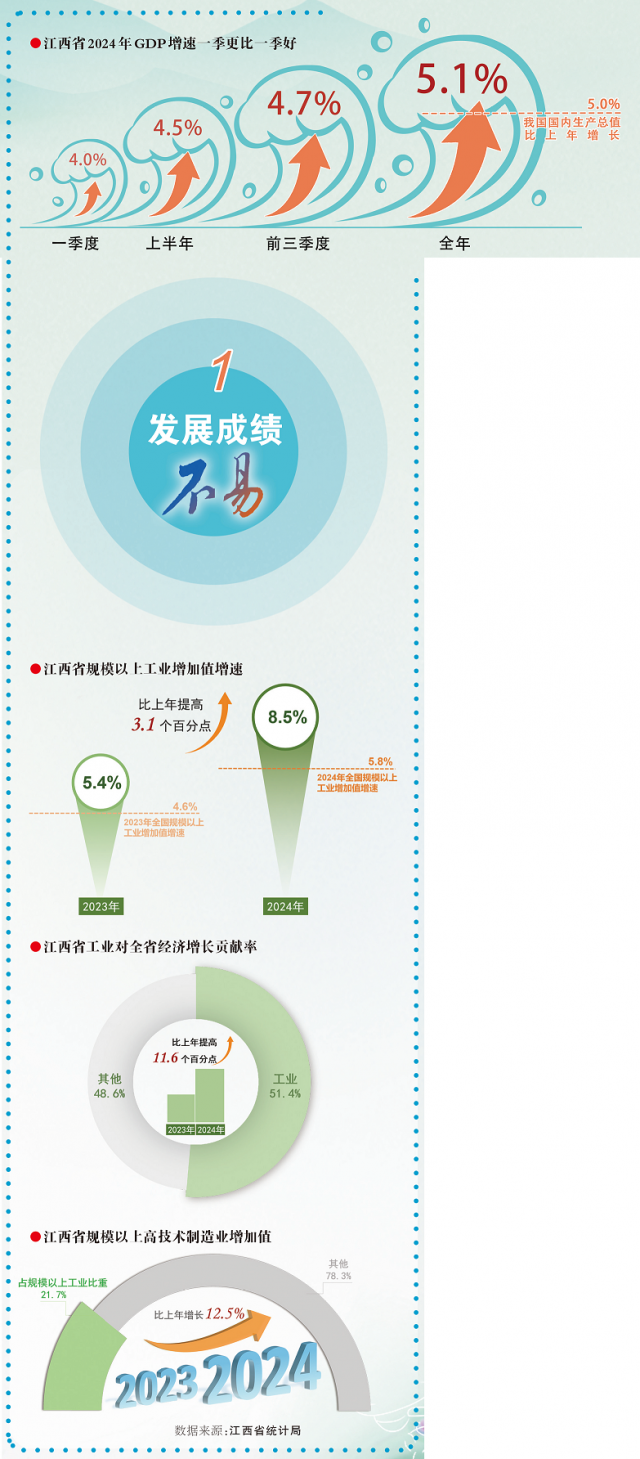 2024年,从一季度的4.0%到上半年的4.5%、从前三季度的4.7%到全年的5.1%,我省GDP增速串成一条逐季上扬的线条,见证了攀“高”逐“新”的江西韧劲十足、潜力无限。