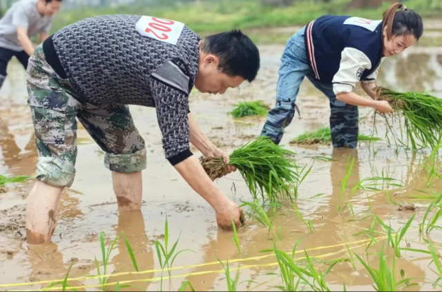 随着裁判一声令下,选手们在田间各显神通,埋头弯腰,迅速“后退”,一手拿着秧苗,一手分秧、插秧,动作娴熟。观众在田边助威加油,比赛现场一派热火朝天。