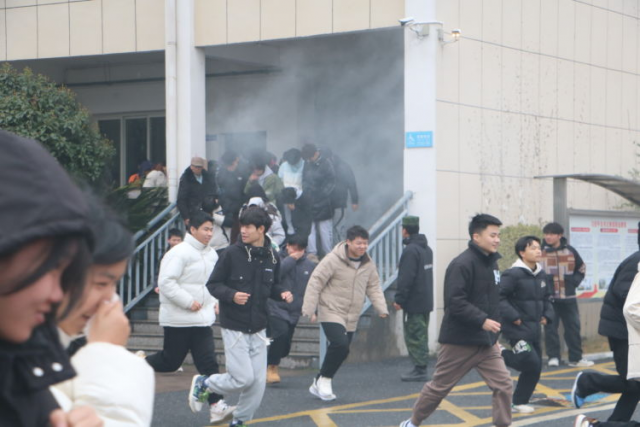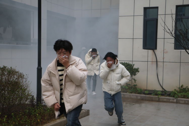 此次消防演练,于学生宿舍、教学楼分别进行,模拟出现火灾的场景,引导学生进行消防安全应急疏散。学生在教师、教官、宿管的引导下快速疏散到学校田径场,远离模拟火场。此时校园内浓烟滚滚,同学们按照疏散要求,用湿毛巾或衣服捂住口鼻,弯着腰尽量贴近地面,沿着指定的楼梯口快速撤离。有序疏散至学校操场中央,然后各班清点人数、上报情况。