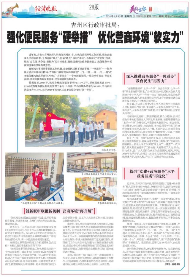 高频民生事项联审联批工作机制、企业跨区迁移不见面审批、“一网通办”……作为优化营商环境的主阵地,吉州区行政审批局持续推进“一门、一窗、一网、一次、一链”政务服务便民化改革路径,唱响了“吉事即办”“一个电话服务到、一枚公章审批完”等改革品牌,营商环境得到显著优化,民生满意度不断提升。
