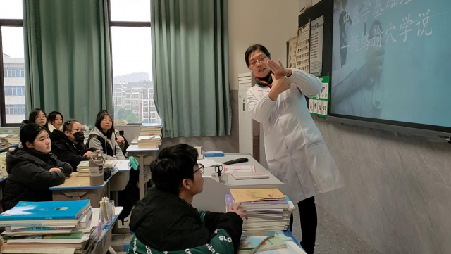 课中,蒋小芳以“中医学基础—经络腧穴学说”为题,通过图谱、课件及视频的方式进行讲解,展示了人体的经络走向,以及各处穴位的名称,还让学生上台亲身感受,手把手现场指导,让学生们近距离地感受到了中医药的神奇,学生们都非常踊跃地参与其中,与小伙伴们交流“切磋”。