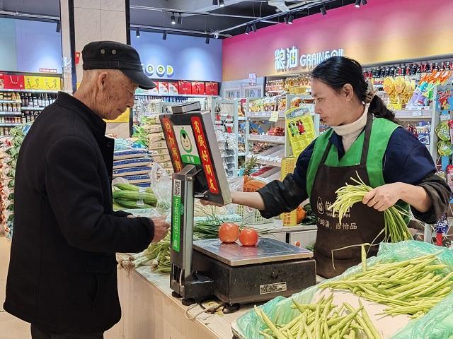 来到附近的好邻居生活超市,收银台前排起长队,身穿绿马甲的工作人员正忙着补货。当季水果在暖光灯下泛着诱人光泽,特价鸡蛋筐前摞起的塑料篮已叠成小山。不少银发老人推着买菜小拉车,在生鲜区挑选着新鲜的蔬菜。“超市开在家门口,下楼走五分钟就到了。”王大爷拿起两捆油麦菜,满脸笑容地说,“这儿的商品种类丰富,要啥有啥,价格还特别亲民,跟批发市场似的,这可比以前赶早市舒坦多了。”