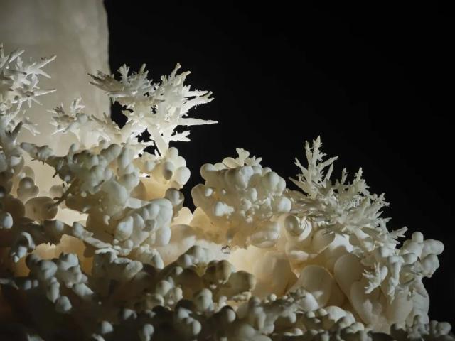 探险队员在洞内发现的“石葡萄”上长“石花”景观。新华社发(赵揭宇摄)