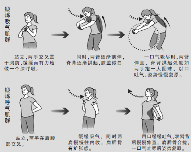 现代人普遍呼吸浅,用到肌肉的次数少,相关肌肉退化。以下锻炼三步连续做完为一遍,反复做数遍至十几遍不等,可强化肌肉力量。不便久站的人士也可坐着做。